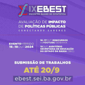 O IX Encontro Baiano de Estatística (EBEST) inicia o período de seleção de trabalhos para exposição de pôsteres. O evento bianual, realizado pela Superintendência de Estudos Econômicos e Sociais da Bahia (SEI) em parceria com o Departamento de Estatística da Universidade Federal da Bahia (UFBA), apresenta este ano o tema “Avaliação de impacto de políticas públicas: conectando saberes”. O objetivo é explorar a importância da integração entre estatística, ciência de dados e políticas públicas, com foco na avaliação de impacto.