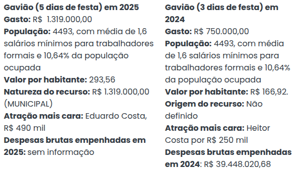 De acordo com o IBGE, o município teve em 2024, R$ 43.664.143,98 de despesas brutas empenhadas. O ano equivale ao último levantamento feito pelo Instituto. Desta forma, em 2024, ano em que o investimento foi R$ 750.000,00, o valor gasto nos festejos juninos equivale a 1,72% das despesas brutas empenhadas no ano.