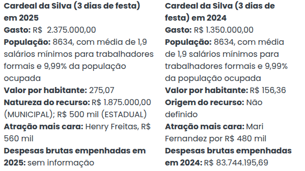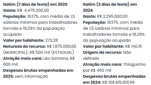 Em uma comparação com os dados de 2024 fornecidos pelo MP, as cinco cidades listadas neste ano tiveram um aumento considerável no investimento para os festejos juninos em 2025, sendo a maior delas em Itatim, com um aumento de R$ 2.180.000,00.