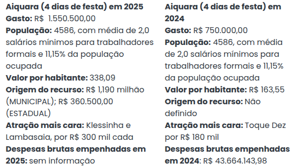 O maior gasto por habitantes em uma cidade baiana foi em Aiquara, que tem renda per capita de R$ 12.244,83 (dado de 2021). Governado por Valeria Ribeiro Santos (PP), o município investiu, de acordo com o MP, R$ 338,09 por habitante para promover quatro dias de festa para a cidade. A população estimada do município, de acordo com o IBGE, é de 4.586, com um investimento de R$ 1.550.500,00.