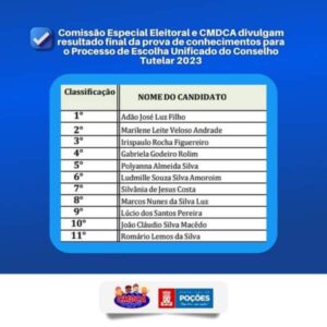 A Comissão Especial Eleitoral e o CMDCA tornaram público, nesta terça-feira (1), no Diário Oficial, o 𝗿𝗲𝘀𝘂𝗹𝘁𝗮𝗱𝗼 𝗳𝗶𝗻𝗮𝗹 𝗱𝗮 𝗽𝗿𝗼𝘃𝗮 𝗱𝗲 𝗰𝗼𝗻𝗵𝗲𝗰𝗶𝗺𝗲𝗻𝘁𝗼𝘀 𝗱𝗼 𝗣𝗿𝗼𝗰𝗲𝘀𝘀𝗼 𝗱𝗲 𝗘𝘀𝗰𝗼𝗹𝗵𝗮 𝗨𝗻𝗶𝗳𝗶𝗰𝗮𝗱𝗼 𝗽𝗮𝗿𝗮 𝗠𝗲𝗺𝗯𝗿𝗼𝘀 𝗱𝗼 𝗖𝗼𝗻𝘀𝗲𝗹𝗵𝗼 𝗧𝘂𝘁𝗲𝗹𝗮𝗿, para o quadriênio 2024/2028.