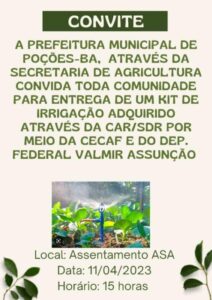 A Prefeitura de Poções, através da Secretaria de Agricultura, convida toda população, na próxima quinta-feira (20), às 08h, para a 2ª Feira da Agricultura Familiar do nosso município.