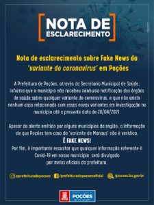 A Prefeitura de Poções, através da Secretaria Municipal de Saúde, informa que o município não recebeu nenhuma notificação dos órgãos de saúde sobre qualquer variante do coronavírus, e que não existe nenhum caso relacionado com essas novas variantes em investigação no município até a presente data de 28/04/2021.