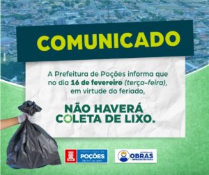 A Prefeitura de Poções, através da Secretaria Municipal de Infraestrutura e Serviços Públicos, informa que devido ao ponto facultativo de Carnaval, na terça-feira (16/02) não haverá coleta de lixo. O serviço retorna normalmente no dia seguinte, quarta-feira de Cinzas (17/02). Recomendamos à população uma atenção maior no descarte dos resíduos sólidos, evitando que o lixo fique na rua antes do dia do recolhimento.