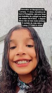 A família da menina Lorrany, de apenas 11 anos de idade está desesperada, ela teria saído de casa na tarde da última quarta (20), para fazer um trabalho de escola na casa de uma colega, mas desde então ninguém tem mais notícias.