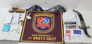 RONDESP durante patrulhamento pela rua da Conquista avistou um indivíduo, que posteriormente foi identificado como Marcos, vulgo tucano TKN (camisa preta) em fundada suspeita e que ao avistar as RONDAS tentou evadir. Não obtendo êxito, assim, logo alcançado e ao proceder com a busca pessoal no mesmo, foi encontrado em sua cintura um revólver calibre .38 municiado com 05 munições. No apartamento alugado por ele havia mais 02 indivíduos: Wendel, vulgo WS (blusa amarela) e David, vulgo grande, blusa vinho, também mais 01 revólver cal. . 32 municiado com 6 munições, além de uma balança de precisão; 03 pedaços médios de substância análoga a maconha; 01 pedaço de substância análoga a cocaína; uma faca para cortar a droga; chips diversos. Todos os indivíduos são da cidade de ilhéus e pertencem à facção RAIO A. Tanto os envolvidos, quanto os ilícitos foram apresentados a autoridade competente para adotar as medidas necessárias